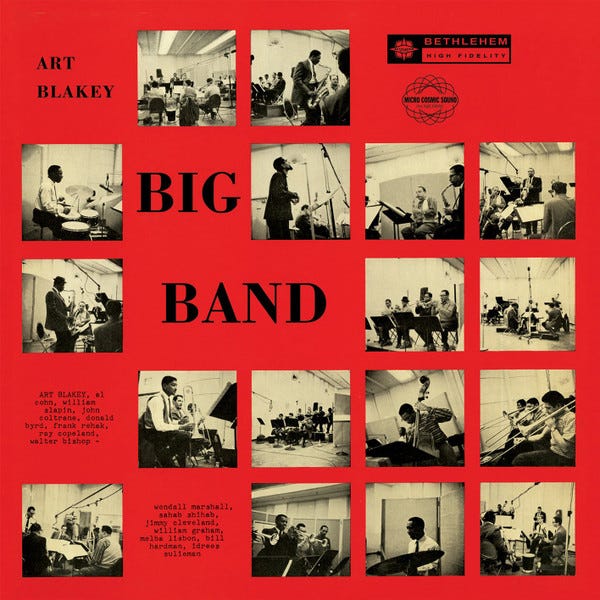 Last month I raved at length about the great Donald Byrd in my monthly recap, and have since been hipped to yet another killer sideman appearance I didn’t know about. On Art Blakey Big Band (Bethlehem Records, 1957), Byrd joins Blakey in a big band setting featuring the monster line-up of John Coltrane, Walter Bishop Jr., Al Cohn, Sahib Shihab, Wendell Marshall, Ray Copeland, Bill Hardman, Idrees Sulieman, Frank Rehak, Jimmy Cleveland, Melba Liston, Bill Graham, and Bill Slapin. One listen in and I was hooked, though the real highpoint for me are not the big band songs — which don’t get me wrong, are all fabulous — but the two Art Blakey Quintet 2 numbers that oddly fall in the middle of the track listing. Byrd really shines on these (as does Coltrane and the rest of the group), in particular on the absolutely ripping “Tippin’.” I don’t know how this record eluded me for so long, but I love that after all these years I can still discover jazz treasures like this.